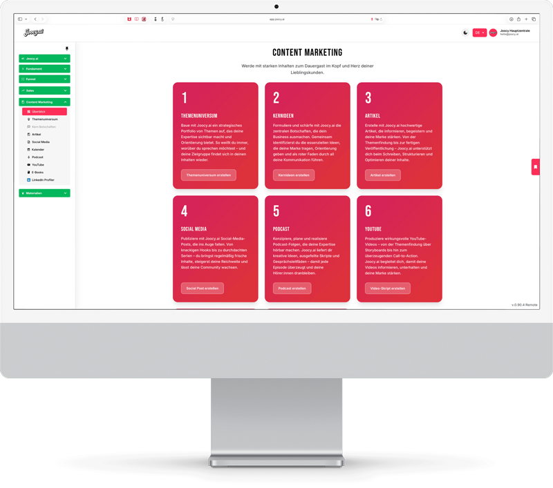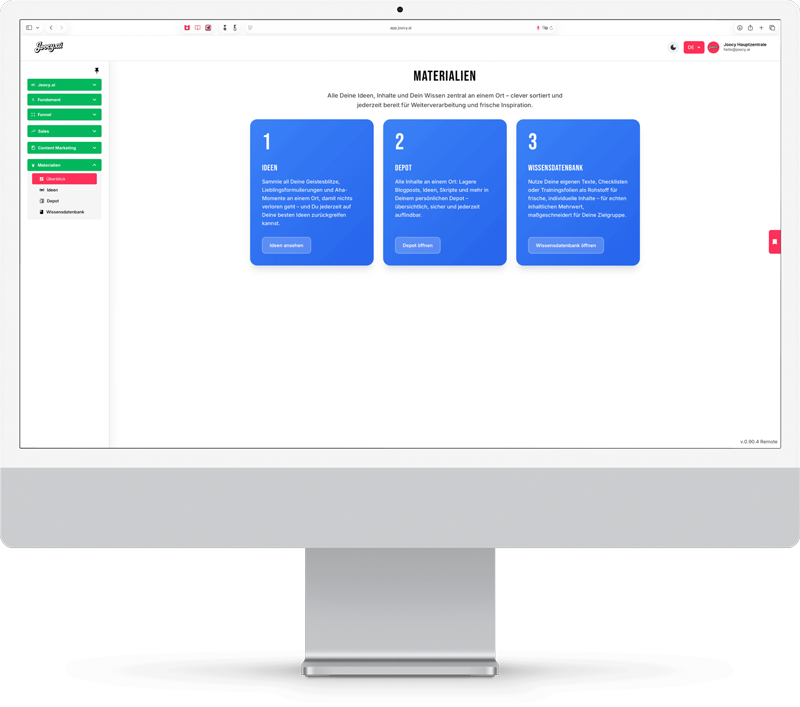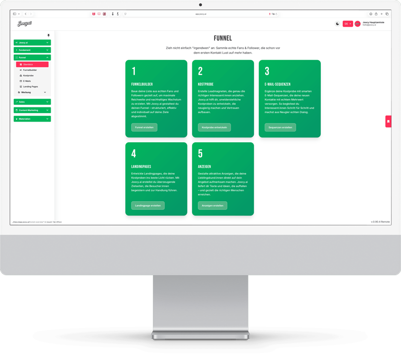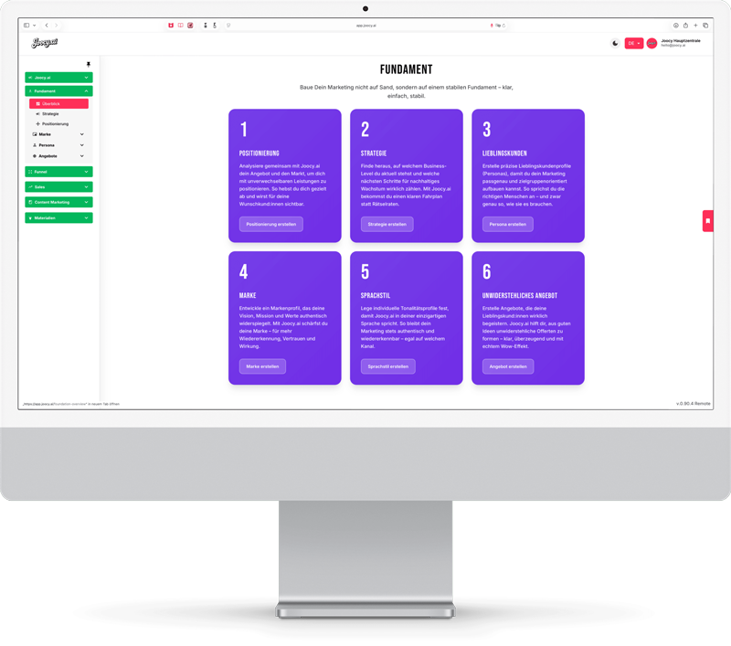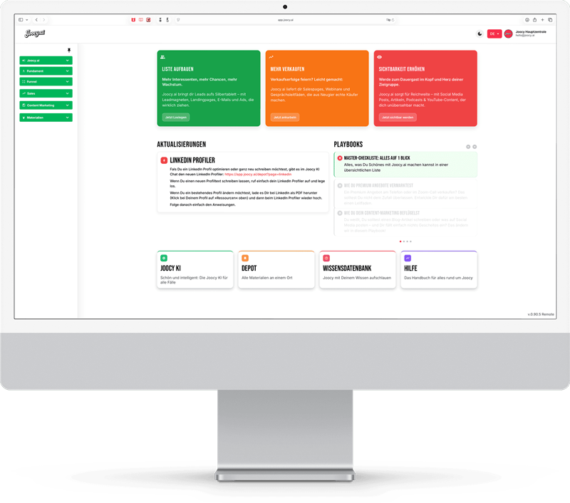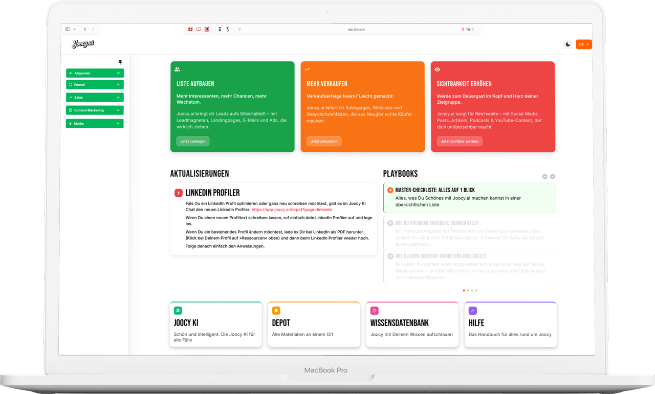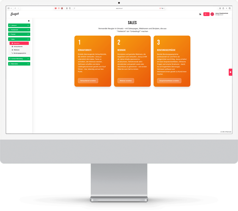Joocy.ai bringt deine Verkaufsmaschine auf Hochtouren: Egal ob Salesletter, Webinare, Gesprächsleitfäden oder Anzeigen – Joocy.ai liefert, was verkauft.